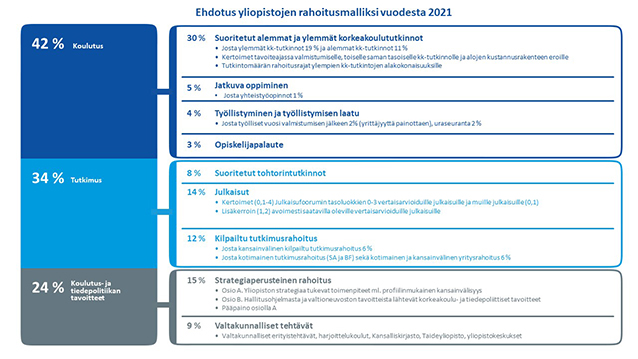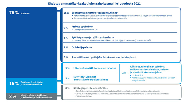 Tutkintojen osuutta ammattikorkeakoulujen rahoituksessa kasvatettaisiin 56 prosenttiin (nyk. 40 %) ja yliopistojen rahoituksessa 30 prosenttiin (nyk. 19 %). Tutkinnoissa huomioitaisiin jatkossa alakohtaisia eroja, nopeampaa valmistumista ja korkeakoulupaikkojen tehokkaampaa käyttöä. Myös yliopistojen tutkimuksen ja ammattikorkeakoulujen TKI-toiminnan kokonaisrahoitusosuudet kasvaisivat yhdellä prosenttiyksiköllä. Jatkuvan oppimisen, työllistymisen ja kansainvälistymistä tukevan kilpaillun rahoituksen sekä yliopistojen julkaisujen kannusteita vahvistettaisiin.