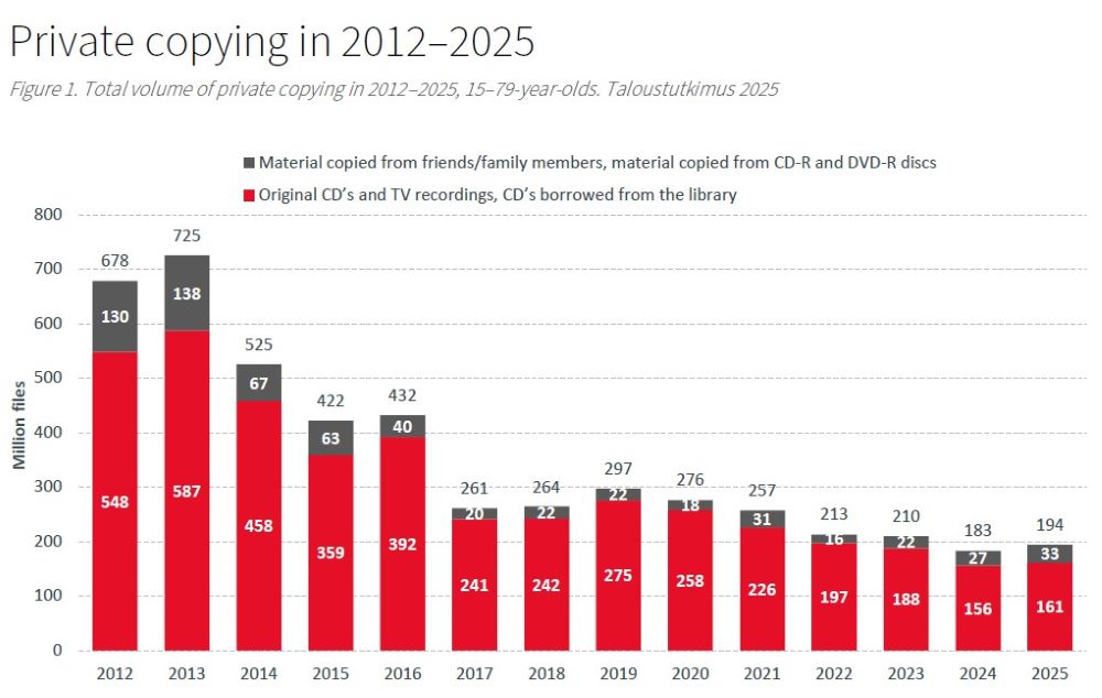 Private copying in Finland continues to decrease in terms of the number of people involved, even though the overall volume of copied files has not significantly changed. According to Taloustutkimus’s 2025 survey, 661,000 people in Finland copied either music or video material. This figure is lower than in 2024, when 709,000 people copied either music or videos.