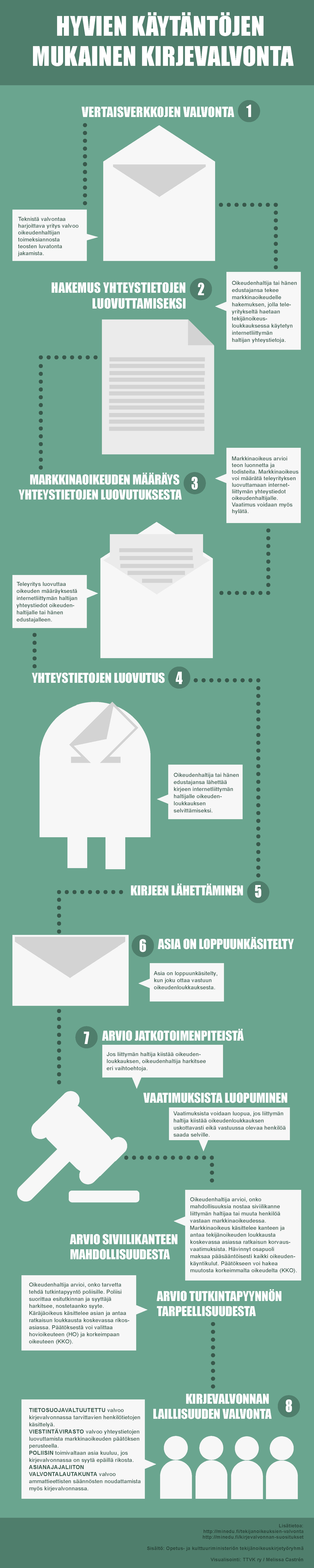 7c. Arvio tutkintapyynnön tarpeellisuudesta. Oikeudenhaltija arvioi, onko tarvetta tehdä tutkintapyyntö poliisille. Poliisi suorittaa esitutkinnan ja syyttäjä harkitsee, nostetaanko syyte. Käräjäoikeus käsittelee asian ja antaa ratkaisun loukkausta koskevassa rikosasiassa. Päätöksestä voi valittaa hovioikeuteen (ho) ja korkeimpaan oikeuteen (kko). - Kirjevalvonnan laillisuuden valvonta. Tietosuojavaltuutettu valvoo kirjevalvonnassa tarvittavien henkilötietojen käsittelyä. Viestintävirasto valvoo yhteystietojen luovuttamista markkinaoikeuden päätöksen perusteella. Poliisin toimivaltaan asia kuuluu, jos kirjevalvonnassa on syytä epäillä rikosta. Asianajajaliiton valvontalautakunta valvoo ammattieettisten säännösten noudattamista myös kirjevalvonnassa.
